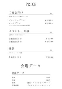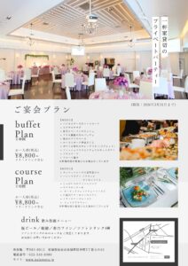 1棟完全貸し切りが可能です。忘年会や歓送迎会などのご宴会・パーティではバンケットルームに隣接する専用キッチンでコース料理やビュッフェ料理などお客様のご希望に合わせてお料理やパーティスタイルのご提案をさせていただきます。また広々としたロビーで商談スペースとしてもご利用可能です。